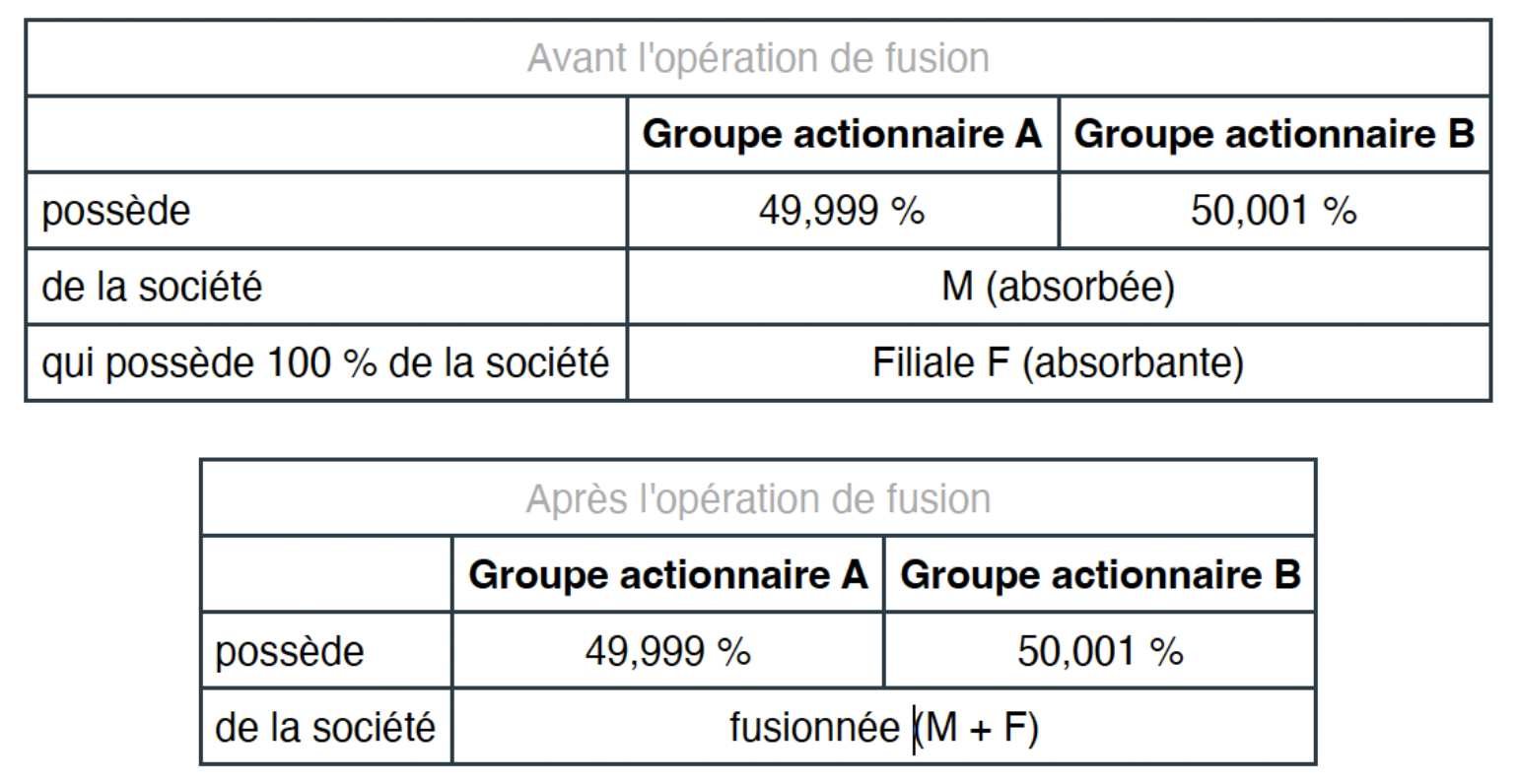 La situation présentée est la suivante : la société holding M détient 100% des titres de sa filiales F. La société holding est détenue par deux groupes actionnaires distincts A et B, qui ne sont pas sous contrôle commun. Au cours de l’exercice, la filiale F absorbe sa société-mère M. A l’issue de cette opération, les groupes actionnaires conservent les mêmes proportions détenues dans les sociétés qui fusionnent.